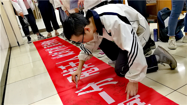 高三年级15个班级在年级统一安排的基础上,各显神通,精心组织安排了丰富多彩的班级特色活动。有的班级邀请任课老师、家长和优秀学长学姐精心录制励志视频为同学们加油;有的班级集合师长们的寄语、学生的自述、诗朗诵等多种形式为学生们鼓劲;有的班级以宿舍为单位录制自我励志视频,互相鼓励,携手共进;有的班级学生用自制短视频、RAP歌曲等多种形式彼此打气鼓励;有的班级回顾班级辉煌时刻,并展示了同学们自己的远大理想;有的班级回首同学们在一起时的幸福瞬间,寻找身边的榜样力量,讲述日常的苦恼,畅想明亮的未来;有的班级自述“心语心愿”,共享“诗词佳唱”,在声声祝福中昂首向前冲;有的班级将班级表彰和和高考接力相结合,为高三学子们再续前进的动力;有的班级特别推出了微信公众号专题文章……所有的班级都设置了共同许愿、高唱班歌、激情宣誓等活动环节,大多数班级还给学生们准备了各具特色的蛋糕、点心、水果等,使整个主题活动更加丰富多彩。