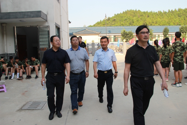 2020年9月4日下午新北区教育局副局长杨仁元、基础教育处处长蒋辉和教师发展中心主任庞宏伟亲自来到常州市溧阳青龙山训练基地,亲切看望我校参加军训的七百多名高一新生,省奔中校长王奕飞、副校长纪晓平和军训营营长范厚忙陪同视察。