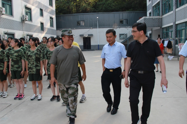 杨仁元副局长一行首先来到训练场看望正在军训的学生和教官,对这五天辛勤训练的学生给予关心和鼓励,王奕飞校长详细地汇报了这五天学生军训的作息时间、训练强度、身体状况等问题。杨局长指出,本次军训在传统科目的基础上,增加了真人CS军训模拟演练、篝火晚会等项目,活动内容丰富,拉近了学生间的关系。