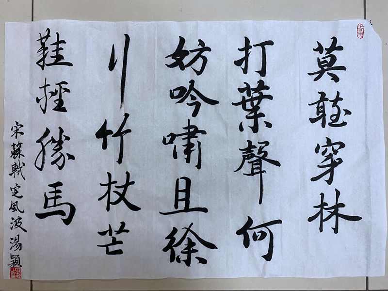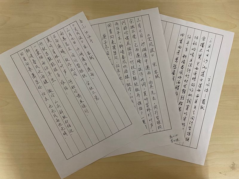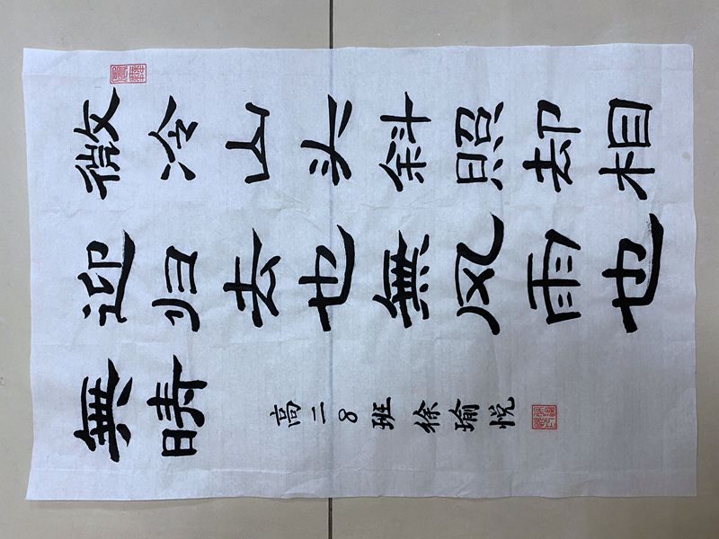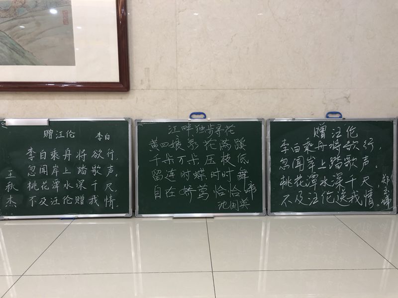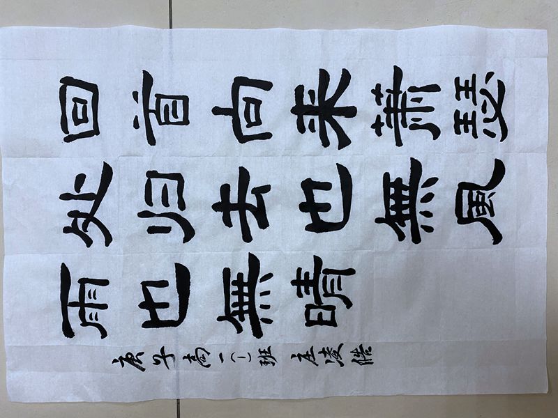 此次书法比赛,学生组分为硬笔书法和软笔书法两个项目,教师组分为粉笔字和软笔书法,于12月8日和12月9日现场进行,书写内容为苏轼的《定风波》、李白和杜甫的七言绝句,字体形式不限。比赛现场紧张有序,学生和老师们都聚精会神的执笔书写,从容自若的展示着自己的才华。经过半个小时的竞技,师生交出了自己满意的作品。此次书法比赛既是学生书法交流的平台,也是教师展现风采之所。学生300多幅的参赛作品有的笔力劲挺,有的大气磅礴,有的气韵生动,有的丰厚雍容,无论是端庄秀丽的楷书,还是行云流水的行书,都展示出了书法艺术在省奔中的良好传承。而教师们在繁忙的课业中,以身作则,挥毫泼墨,将自己对书法的热爱,充分融入到自己的作品中,或笔走龙蛇,不拘一格,或朴实无华,却兼纳乾坤,产生了积极的影响。