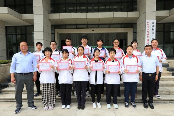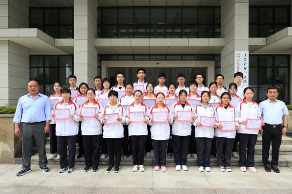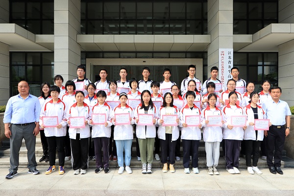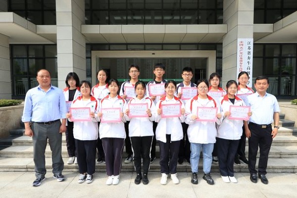王奕飞校长、李平副校长和荣获“绘春杯”诗词创作比赛一等奖的同学合影