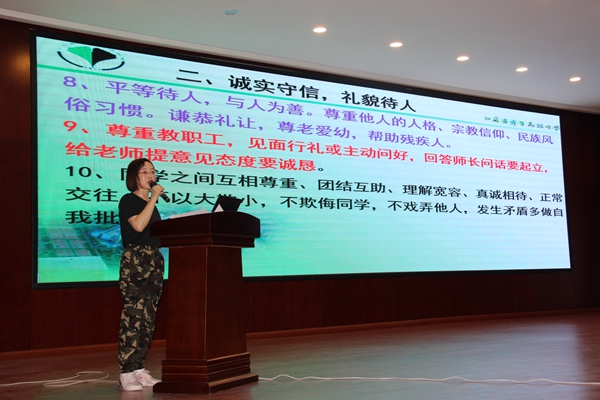 学生处主任沈国英老师为同学们带来了纪律规则讲座。沈老师通过讲述树与树林、扳道工的故事、哈佛学生还书故事等一系列真实而鲜活的事例,向大家展示了规则的重要性:遵守规则,就是善待生命;遵守规则,就是体现高尚人格。马卡连柯曾说过,纪律是集体的外貌、集体的声音、集体的灵魂和集体的信念。每一个集体,比如学校、年级、班级、宿舍等等都要有严明的纪律作为保障。希望同学们在以后的生活中,以规则约束自我,以规则成就自我!