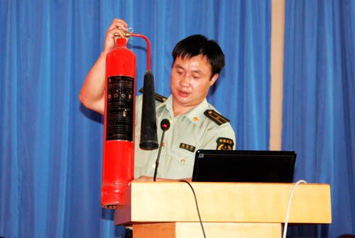 最后,张大队长又仔细讲解了消防灭火器上各种标志所代表的含义、如何正确使用消防灭火器材以及在平时如何正确放置、检查消防灭火器材,特别提出要对消防灭火器材及时检修、更换。
