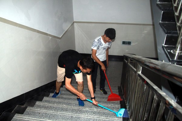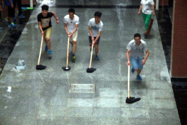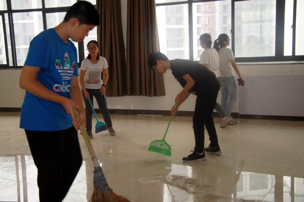 秋雨骤临,新生们带着劳动工具,排队来到博文楼、知行楼,按照班级分工,打扫各楼层的教室、走廊、楼梯间。他们分工明确,相互配合,积极认真地扫地、擦窗、擦黑板、拖地、整理杂物……尽管窗外风吹雨打,新生们却干得热火朝天。