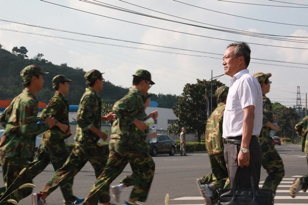 一个路口,一个转弯,渐渐地行军速度慢了。太阳的威力加剧,新生们裸露在外的肌肤发红、发烫、发疼,裹在宽大军服内的躯体,开始潮湿和发痒。可是,没有人停下脚步,几乎没有人擦一擦汗,挠一挠痒。有的只是仿佛衔枚疾走默然无声的队伍。两旁有居民出来看热闹,这群少年啊,把背挺得更直了,把队排得更齐了,仿佛在大声宣誓:“我是省奔中的新生,我能行!”路上有花草,有形形色色的杂货铺,还有突然窜出的家禽猫狗。这群少年啊,目不斜视,听从指挥,互相监督,路上是他们整齐的脚步声。