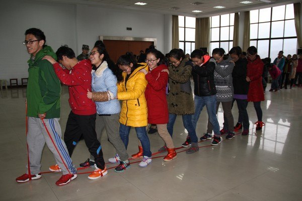 第四个项目是“有轨电车”。全组队员双脚分别用一根绳子绑在一起,头尾两人抓住绳子,向指定方向先进。团队之间必须合作并分享经验,增强团队的凝聚力,步调一致,相互协作才能顺利、高效地完成任务。队员又一次体会到良好沟通对团队合作的重要性。