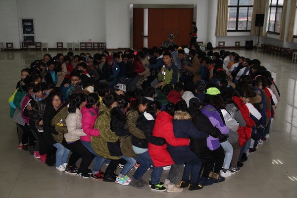 第六项是“圆圈人椅”。所有队员排成一行并围成圆圈,要求脚尖碰到前面队员的脚跟,并举高双手慢慢坐到后面队员的双腿上。队员们跟着教练的口令声,共同迈步向前行走,体会到相互支持的力量,感受到信任与被信任的关系,体验了坚持与责任的联系。