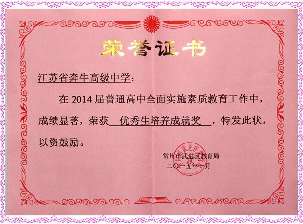 1月30日下午,从武进区中小学素质教育推进会暨学期结束工作会议上传来喜讯,江苏省奔牛高级中学荣获武进区教育局两项表彰,一是连续第八年获“普通高中全面实施素质教育工作特等奖”,二是连续第二年获区“优秀生培养成就奖”。这是武进区教育局对省奔中全面贯彻教育方针,全面实施素质教育,全面服务学生成长发展的高度认可;也是省奔中全体教职工齐心协力、“甩开膀子”干出来的结果。
