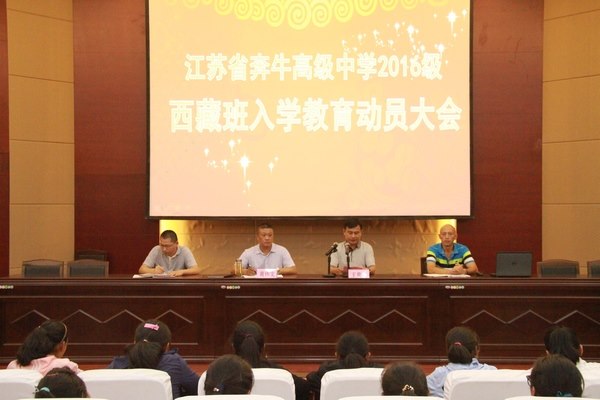 王奕飞校长代表学校向西藏新生录入江苏省奔牛高级中学就读表示祝贺,并对新生提出了期望和要求。他特别提到:省奔中为西藏班的学生搭建了汉藏文化交流的平台和学生奉献服务的平台,西藏学生要积极的在交融与实践中发挥自身的主体性,增强自身的责任意识和奉献精神。戴亚军老师就省奔中学生的行为规范、学习常规工作的开展提出了要求,赵金华老师分别就如何遵守宿舍常规和融入高一年级群体做了针对性的解读,黄伟文副校长结合西藏学生的特点提出了更为具体的要求。