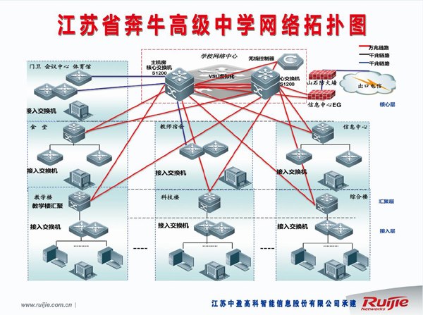 校园网络覆盖多媒体教室、计算机教室、教师办公室、行政办公室、普通教室、图书馆等所有场所。有无线网络系统,实现有线、无线全覆盖。