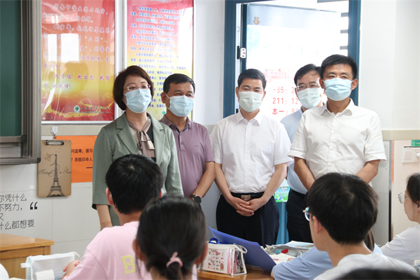 王奕飞校长汇报了学校送考的准备工作以及高三最后一阶段的安排。陈建生充分肯定了学校的周密安排,并强调学校一定要竭尽全力做好服务保障工作,在抓好疫情防控的同时,努力为学生冲刺高考营造良好的生活学习环境,全力保障高考安全顺利。
