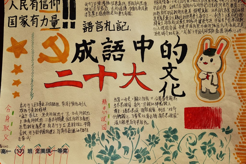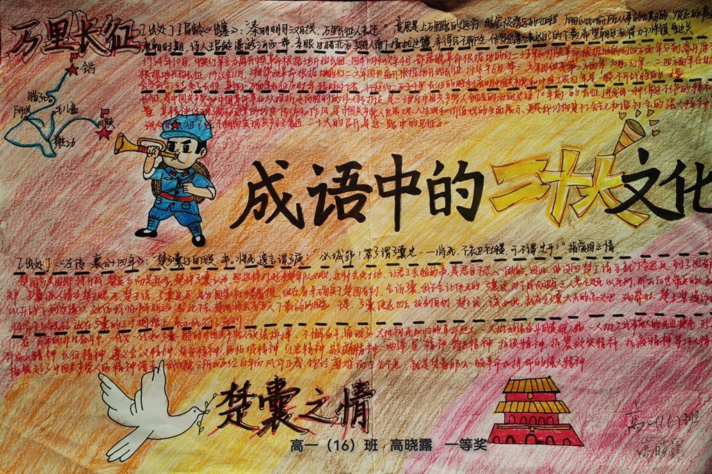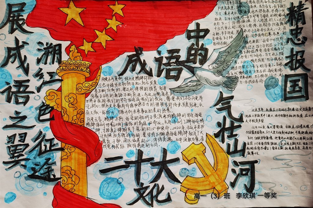 学校制定了以“展成语之翼,溯红色征途”为主题的成语手抄报活动方案,组织高一年级同学利用周末积累包含“家国情怀”精神的成语,探寻成语背后的故事,联系党史,以《成语中的二十大文化》为题,写作语言札记,绘制手抄报,组织评比。