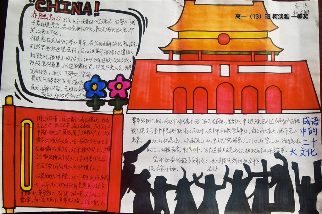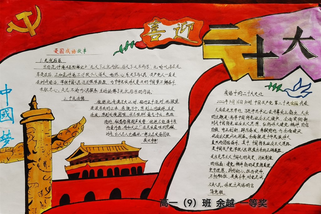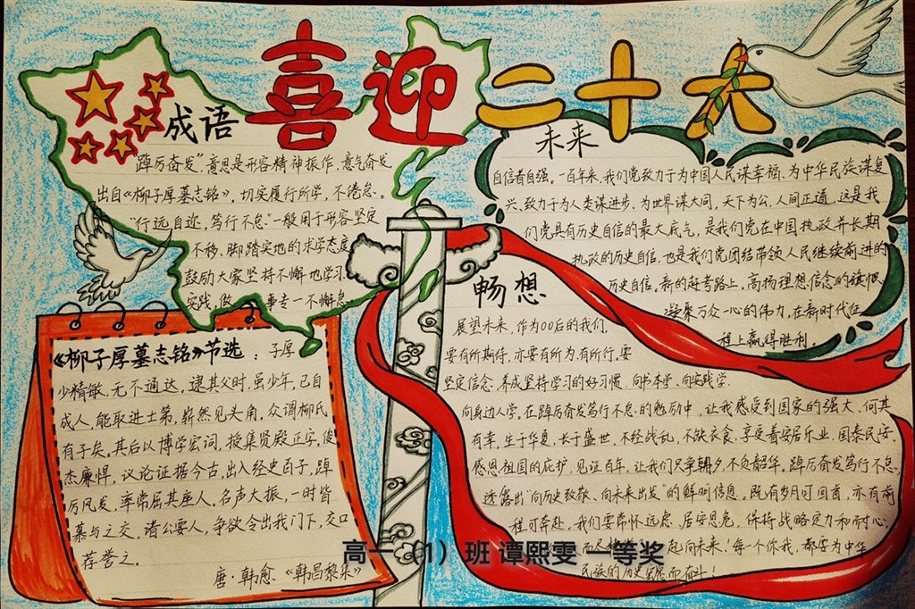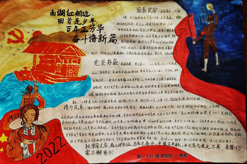 各班学生积极参与,手抄报内容丰富,版面美观,经过语文老师的认真评选,高一(11)班谭熙雯等9位同学获得一等奖,高一(2)班梁家祺等11位同学获得二等奖。通过此次活动,同学们深入了解了党的伟大历程,生发出不负青春、热爱学习的激情。