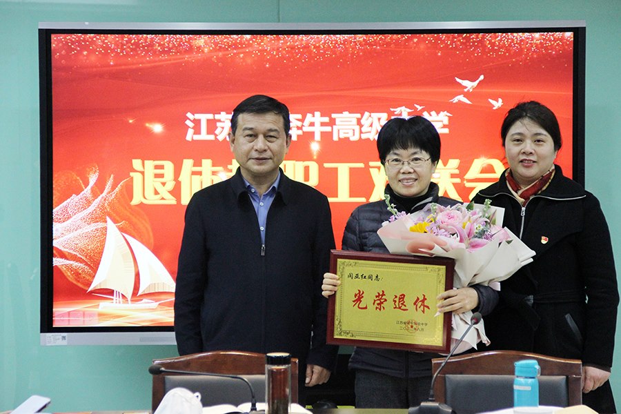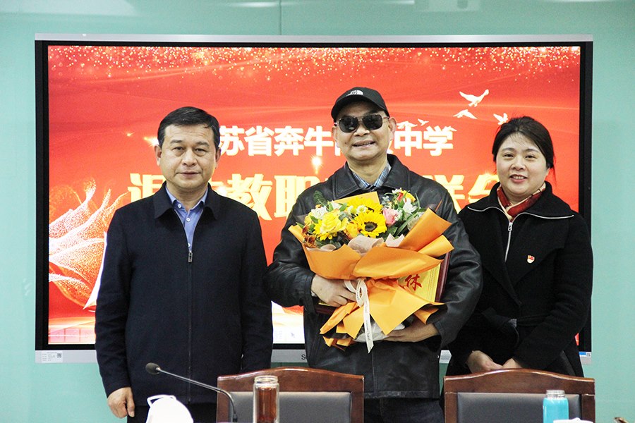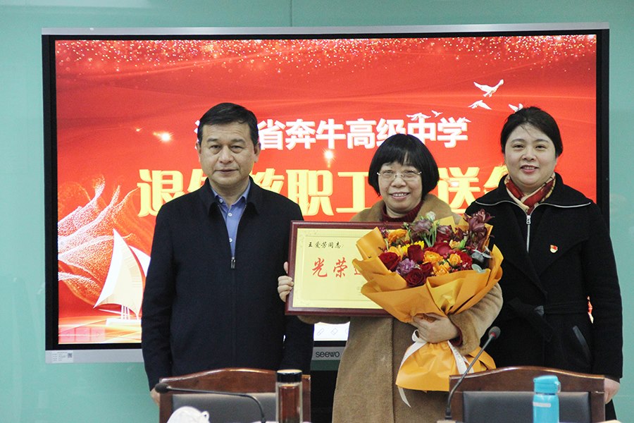 欢送会首先由党委书记、校长王奕飞给退休教职工颁发了光荣的退休证书,工会主席纪晓平献上了美丽的鲜花。