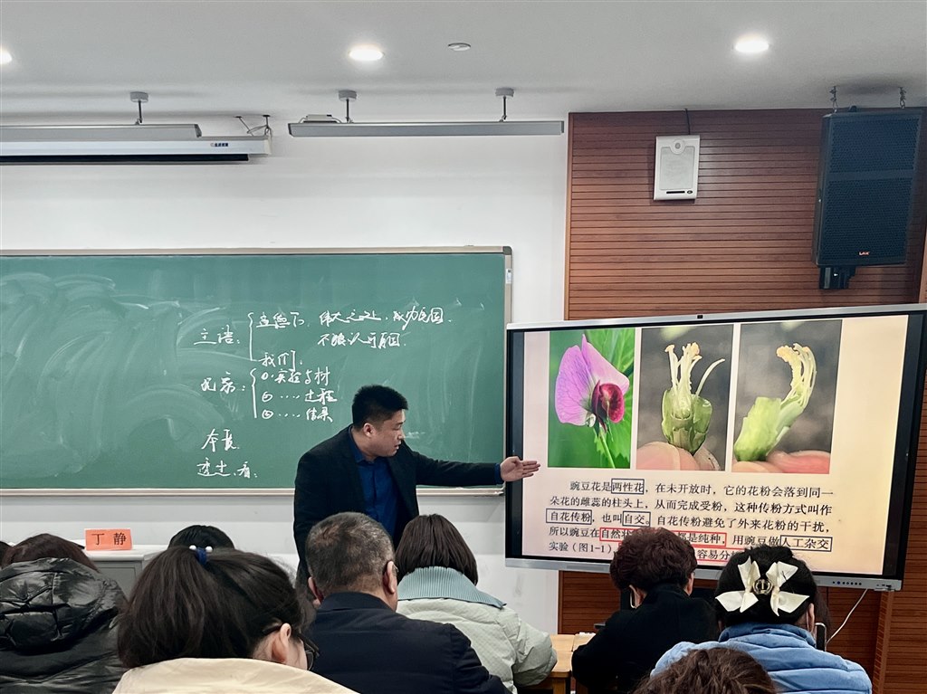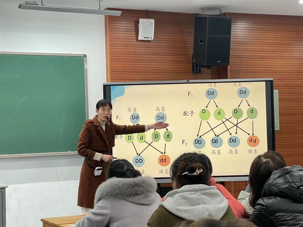 活动伊始,丁静老师垂身示范,与西夏墅中学何莉燕老师共同就“孟德尔的豌豆杂交实验”开展“同课异构”课堂展示。何老师单刀直入主题,分别从豌豆花的特征、豌豆杂交及测交实验现象三个维度创设问题情境,让学生在对话中自主建构孟德尔分离定律的假说内容,然后分小组体验分离比的模拟实验,继而生成演绎推理的逻辑脉路。整节课可谓“一气呵成,行云流水”。丁老师从“四个一”大视域下审视和设计了本节课,依次从“一种植物”、“一个实验”、“一种方法”以及“一个人”的知识境脉设置学习任务,在问题群驱动下揭示科学实践的本质,阐释演绎推理的精妙之处。丁老师最后以对孟德尔成就的哲学探讨升华主题,整堂课气势恢宏,让所有在场的青年教师不禁一声“霜刃未曾试,今日把示君”的钦佩与赞叹!