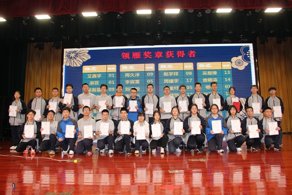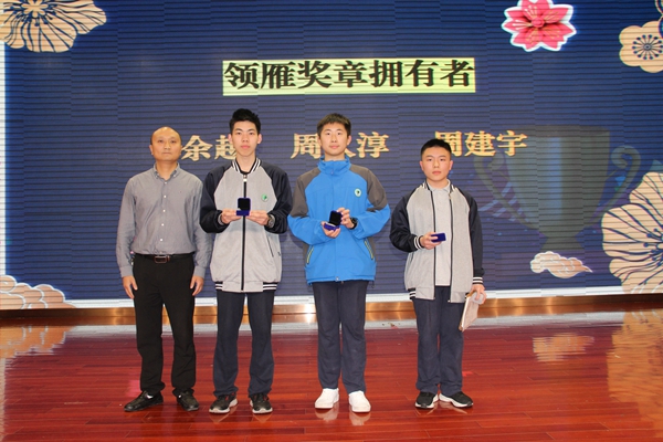 群雁飞翔之时,头雁领航,同向而行,劈波斩浪。姚冬青副校长宣读了年级最高奖——领雁奖章,并为获奖同学颁奖。余越、周久淳和周建宇三位同学经累计,永久获得领雁奖章。