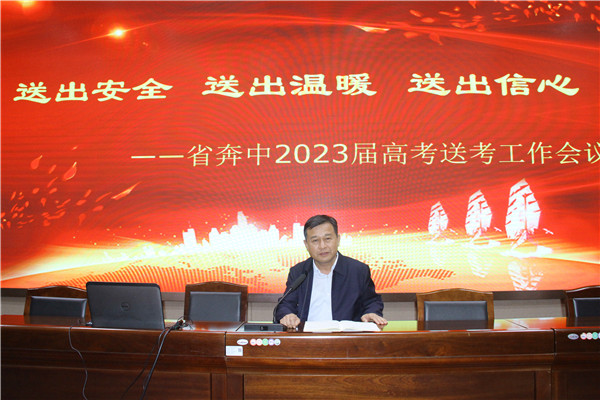 2023届高考长跑即将到达终点,一路奔忙,留下了老师们辛勤的足迹和辛劳的汗水。三年的守护,送考是收官之战。省奔中每年的送考都有良好的传统,见证了老师们温情的关怀。为明确要求、精心组织、万无一失, 6月5日下午四点半,在树人楼报告厅举行了,以“送出安全 送出温暖 送出信心”为主题的2023届高考送考会议。党委书记校长王奕飞、副校长纪晓平和全体送考老师参与了本次会议。