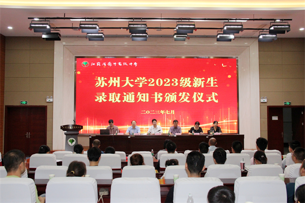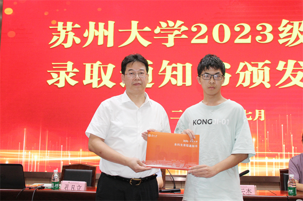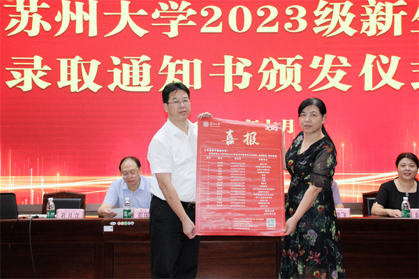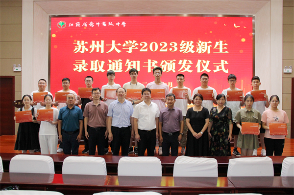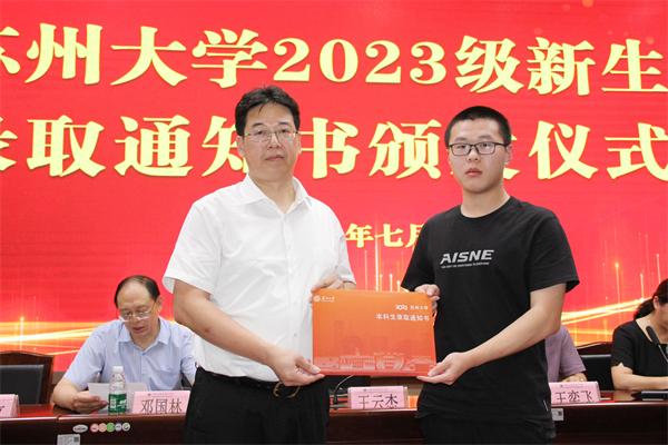 7月23日,大暑,在这个夏天最热烈的日子里,苏州大学校党委常委、组织部长王云杰,社会学院党委书记邓国林,招生就业处就业指导科科长孔凡立一行亲临江苏省奔牛高级中学,为江苏省奔牛高级中学15名苏州大学2023级新生颁发录取通知书。省奔中相关领导,被苏州大学录取的新生及其家长一起参加了录取通知书颁发仪式,本次活动由校党委副书记、副校长纪晓平主持。