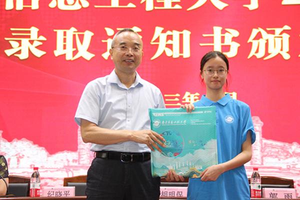 南信大党委常委、总会计师胡明保向省奔中党委副书记纪晓平赠送了新生录取喜报,在苏近娣副校长宣读完省奔中2023届被南信大录取的新生名单后,他将27封录取通知书逐一颁发给各位新生并与他们合影留念。