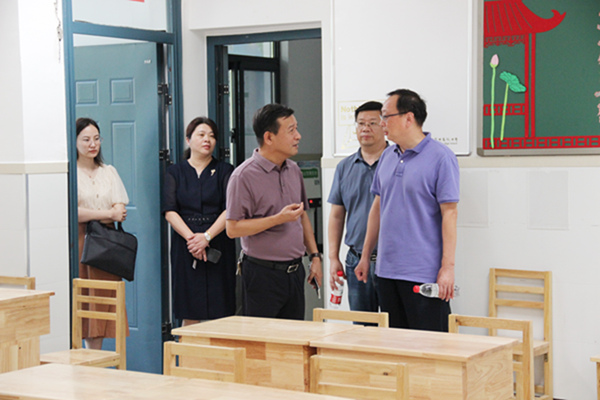 戚宝华一行来到省奔中就直奔现场,实地考察“青海班”同学即将学习和生活的地方。他们在王奕飞校长的带领下,先后参观了学校为50名青海学子精心准备的教室、宿舍。干净明亮的教室、整齐崭新的桌椅、精美温馨的板报、整洁宽敞的宿舍、先进的设施设备……每个细节都彰显出省奔中领导对办好“青海班”的决心,对即将远离家乡赴常州求学的青海学子的关爱。