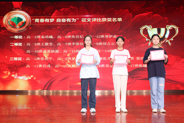 会议开始,教师发展处副主任张薇充分肯定了同学们在入学教育中的整体表现,并对在“青春有梦,自奋有为”演讲及征文比赛、“誓言展风貌 校歌漾芳华”宣誓比赛、校歌合唱比赛中获奖的班级及优秀学生提出表扬。其中“青春有梦 自奋有为”征文评比一等奖获得者:高一(2)班秦珞曦、高一(6)班焦佳忆、高一(12)班郑伊茹;二等奖获得者:高一(5)班王傲莹、高一(7)班李俸钦等6位同学;三等奖获得者:高一(1)班张相宇、高一(3)班夏一诺等8位同学。