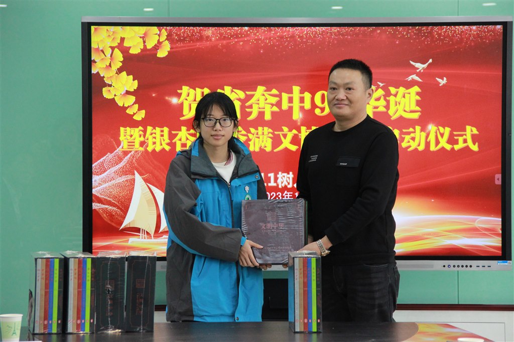 刘勇作为校友代表率先发言,他表示母校带给了他巨大的精神财富,并以“功成不必在我,功成必定有我”自勉,祝愿母校的未来光辉灿烂。随后1998届、1999届、2000届等校友代表用饱含深情的视频表达了对母校的感恩与祝福。在交接捐赠书籍环节中,纪晓平与杨小兵共同展开2000届11班同学捐赠书籍的卷轴,随后校友代表们向学生代表们捐赠了56套“文明中华”系列图册。火红的卷轴,寓意深刻的书籍数量,别具匠心的印章,无不彰显着校友们对母校的深厚感情与诚挚的祝福。