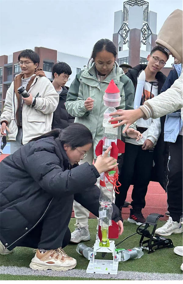 自活动发布以来,高一年级学生热情高涨,踊跃报名,积极地向负责老师咨询学习,他们利用课间活动时间搜集资料、自主设计、准备器材、调试仪器,最终完成自己的作品。12月13日下午第四节课,选手们带着装备精良的“水火箭”集中在比赛场地展开激烈角逐。随着比赛开始,一件件“艺术品”被摆放在操场上,通过注水、打气......“嗖”的一声,“水火箭”在空中划出一道美丽的弧线,尾部喷出一股股水流,现场水花四溅,一道道强大的水柱将火箭猛烈地推向了高空……,伴随着一个个“水火箭”的升空,场面气氛显得愈加热烈、紧张。整个比赛持续了近一个小时,同学们各显神通,掌声、惊叹声、欢呼声此起彼伏,精彩的比赛活动让在场的每一个人都非常激动,给参与观摩的师生带来了一场精彩的学科文化盛宴。
