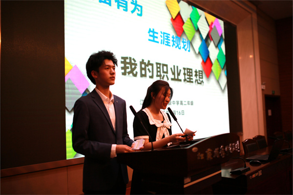 5月16日晚18:30,在学生发展处的组织下,高二年级“我的职业理想”展评活动在树人楼四楼报告厅举行。此次活动以“自奋有为,职业规划”为主题,为学校生涯规划系列活动之一。活动由高二(13)班徐诺、高二(8)班赵梓砚主持。学生发展处副主任王法阳老师、蔡志庆老师、 高二语文教研组长薛钶老师、专职心理教师冯钰老师、徐梦霞老师担任本次活动的评委。