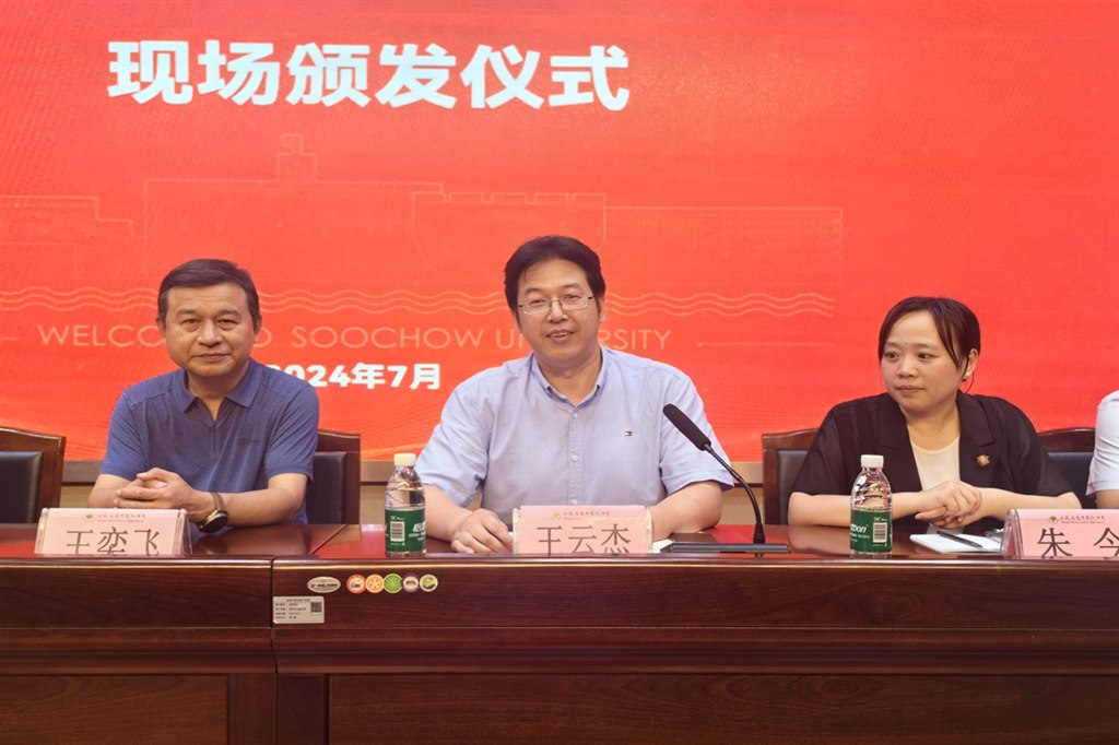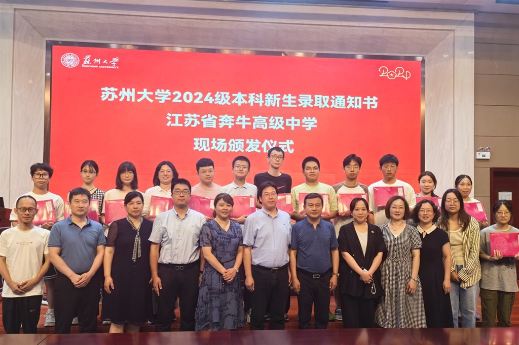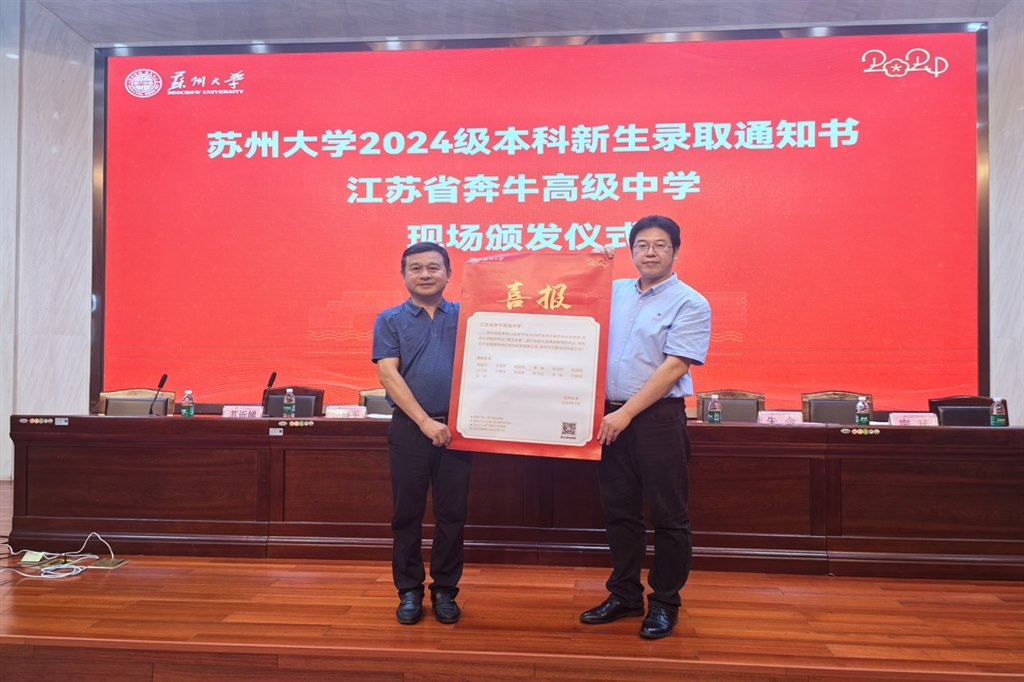 夏日悠悠兴味长,捷报传来添暑凉。7月24日下午,苏州大学校党委常委、组织部长王云杰,社会学院党委副书记朱今,社会学院科研与研究生办公室主任宗琦一行亲临江苏省奔牛高级中学,为我校13名苏州大学2024级新生颁发录取通知书。省奔中校党委书记王奕飞、校长纪晓平、被苏州大学录取的新生及其家长和部分班主任一起参加了录取通知书颁发仪式。本次活动由副校长苏近娣主持。