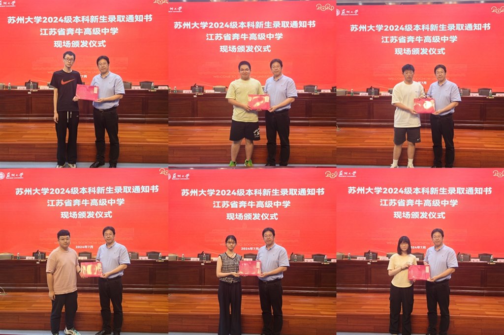 接着,苏州大学王云杰部长向省奔中王奕飞书记颁发了新生录取喜报,朱今书记宣读了省奔中2024届录取苏州大学的新生名单,王云杰部长还为新生们逐一颁发了录取通知书并合影留念。