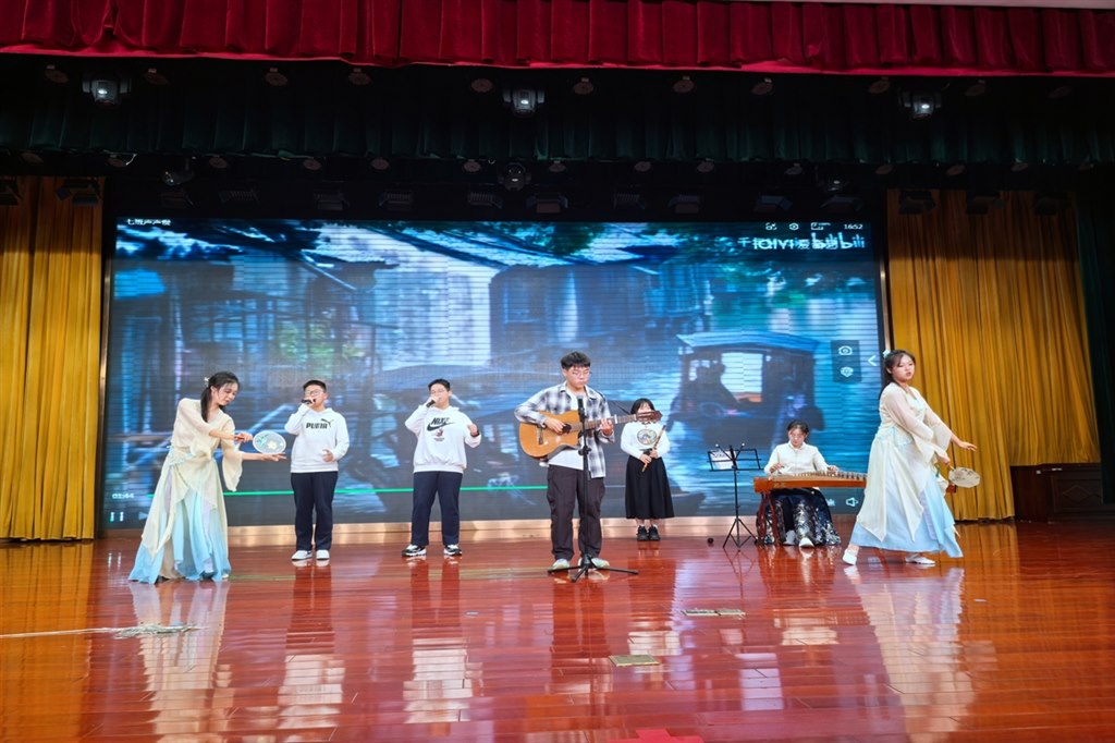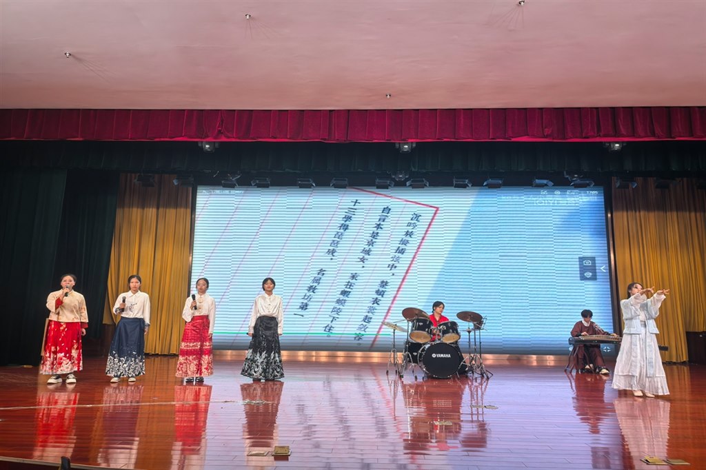 高一5班、9班的舞台剧《高山流水知音情》将高山流水的意境与知音难觅的情感完美融合,令人动容;高一1班、3班的弹唱演奏《将进酒》以激昂的弹唱和深情的演奏,让观众仿佛看到了李白醉卧长安、挥毫泼墨的豪情;于千年后回望历史,高一11班、12班的同学诗歌朗诵《青春中国》,展现了青春的力量与梦想,传达了对祖国未来的无限憧憬与热爱;高一4班、8班的诗歌朗诵《红烛》,用深情而有力的声音,表达了对奉献精神的崇高敬意与深切缅怀;高一13班、16班的诗歌唱演《寻李白》带着全场观众,跟随“诗仙”太白同赏《古朗月行》的“月之奇趣”,共饮《将进酒》的豪迈与不羁;高一14班、15班的同学们以优美的歌舞和精湛的演奏,将《知否知否》演绎得如梦如幻,令人陶醉;高一6班、7班的歌舞演奏《声声慢》宛转悠扬,让人仿佛置身于那个烟雨朦胧、诗意盎然的江南水乡;高一2班、10班的诗歌朗诵《周总理,你在哪里》,在声声呼唤中,读出了对总理深情的告白;高一17班、18班的歌舞演奏《琵琶行》将整个活动现场推向了高潮,歌者的动情演唱和中西乐器碰撞的生动诠释,为现场的观众带来了一场听觉盛宴。古诗词的韵味与现代诗歌的激扬,交织出一幅幅动人的画卷。无论是台上深情演绎的同学,还是台下专注欣赏的观众,都被带入了一个充满诗意的世界,沉浸在浓郁而美好的氛围之中。