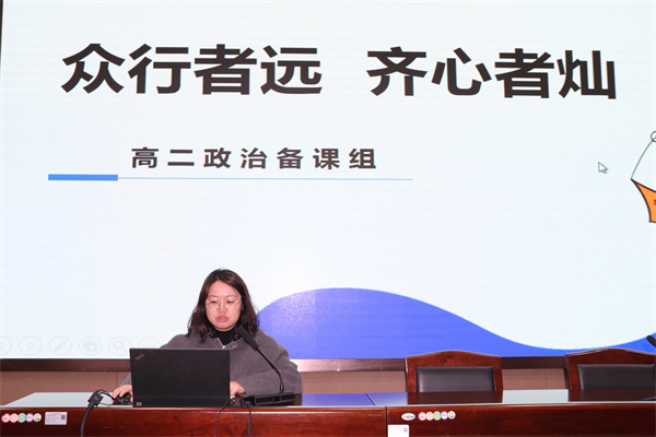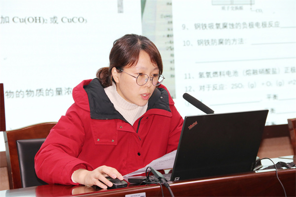 会议第二项议程是工作交流。首先,数学教研组组长范玉科发言。范老师分别从集体备课经验、存在问题分析、改进策略与计划三个角度对高二数学教研组的工作情况进行总结,分享了规范备课流程、资源全面共享、组内凝聚力强等成功经验,也分析了本次考试中暴露的相关问题,进而针对性提出形成“1+X”主题备课、建立听评课闭环等措施。其次,化学教研组长周云花老师以“知不足而后进·望山远而力行”为主题展开汇报,周老师同样展开了基于期末考试的得失分析,指出组内教师们工作细致负责与兄弟学校共享共赢是收获成功的关键因素,化学组也将在接下来的教学中继续加强相关知识训练,努力提高学生实验探究能力与知识的迁移应用能力。随后,政治教研组组长沈燕老师发表主题为“众行者远·齐心者灿”的质量分析报告,包含期末考试分析、备课组工作总结、新学期工作设想等三个层面内容,相信通过本次透彻分析,政治教研组会在即将开始的新学期中取得更好的教学成果。