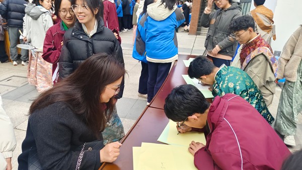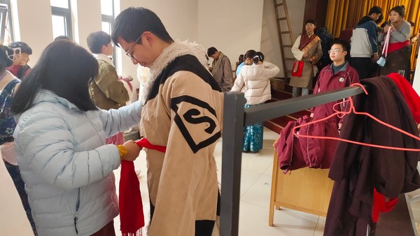 学生们穿着节日盛装给老师、同学们拜年