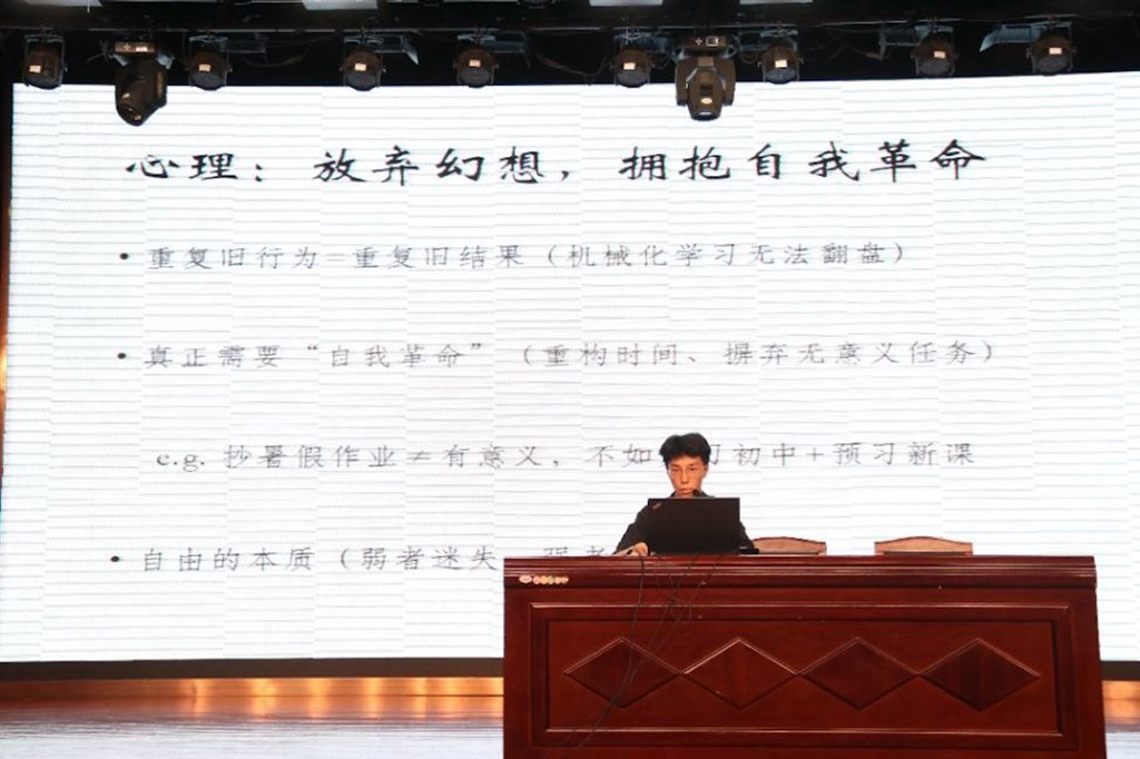 在随后备受期待的优秀学子面对面环节,2025 届优秀毕业生们分享了自己的宝贵经验。刘书睿同学从心理、时间分配、信念三方面给出建议,认为心理上要放弃幻想、重构时间,摒弃无意义的任务;时间分配上要聚焦高考、优化效率,明确课堂、提问、看书、刷题的效率排序及要点;并强调要相信 “相信的力量”,鼓励学弟学妹拥有充实快乐的高中生活。陈杨秋文同学围绕学习方法与心态展开分享,强调学习需兼顾宏观与微观,注重积累,分享了学科笔记方法,提醒新生要主动解决问题,同时调整好心态,鼓励大家接受不完美,以“行如流水不止,心如玉石从容”的状态实现知行合一。余越同学介绍了通用学习方法,包括高效整理错题、做好知识总结等,还重点讲解了语数英主科的学习技巧,如语文多刷真题、重视作文练习,数学攻克每个知识点及解题技巧,英语坚持背单词、多修改作文等,为新生提供了具体可操作的学习路径。