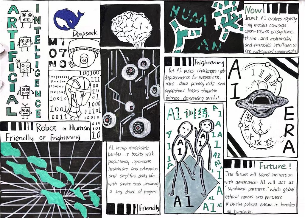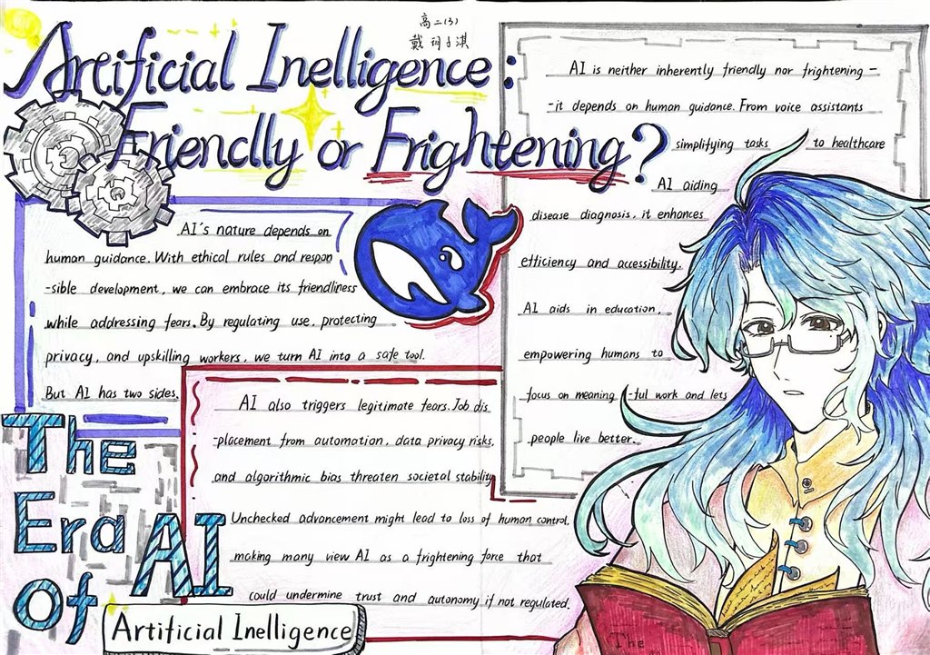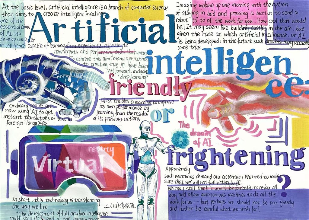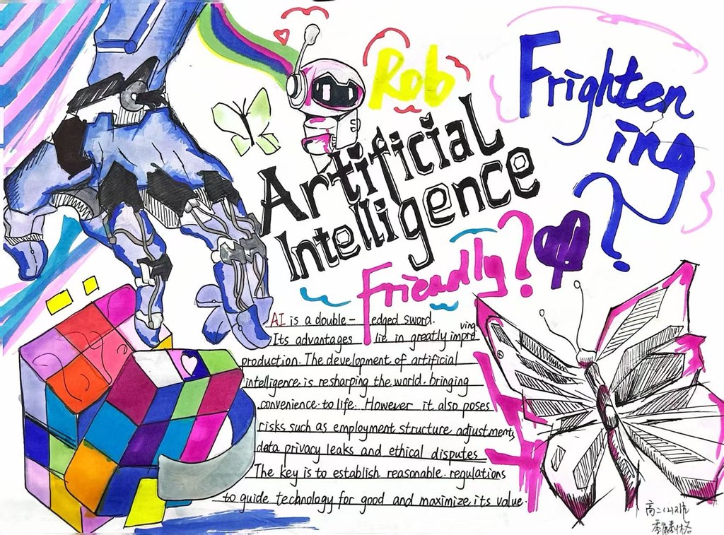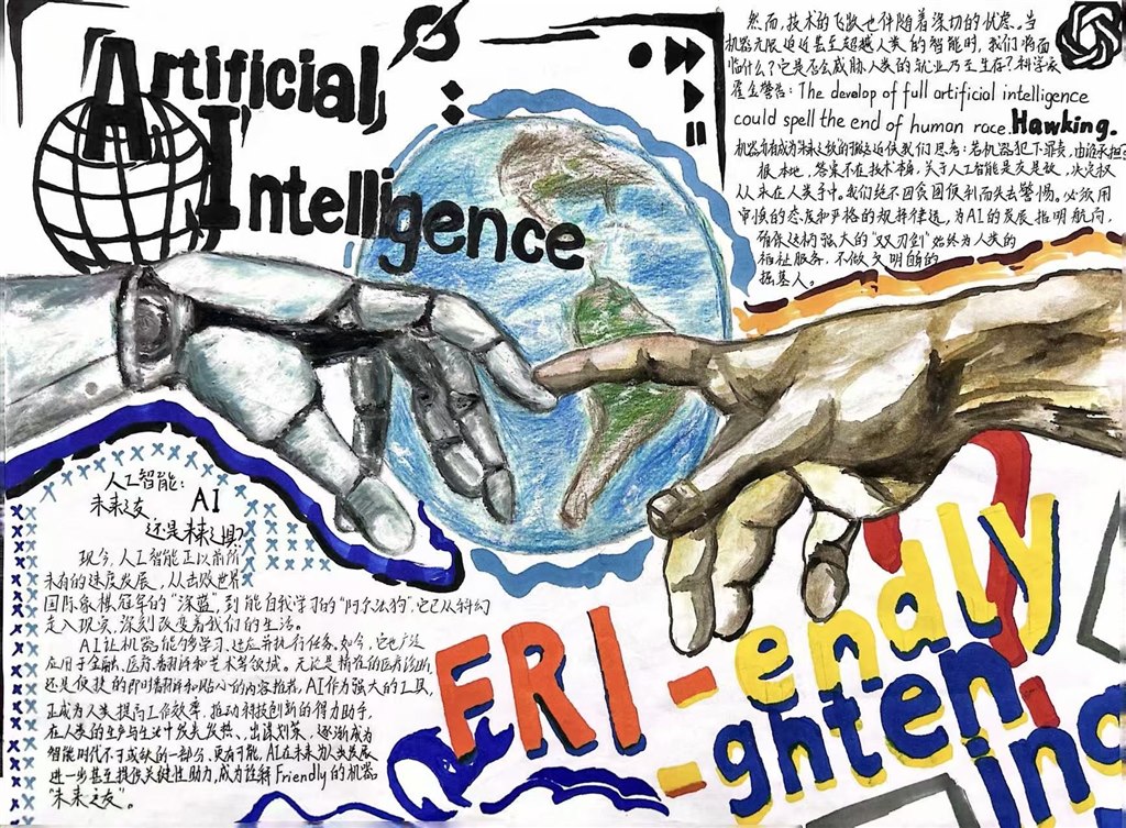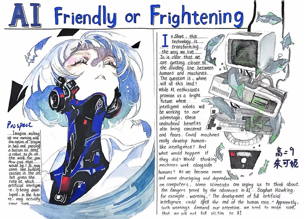 在2025年江苏省奔牛高级中学科技创新节中,高二年级围绕“科技引领未来,创造改变生活”主题开展了英语手抄报制作活动。本次活动聚焦 “Artificial Intelligence: Friendly or Frightening?” 这一话题,学生们以丰富的想象力和扎实的语言表达,呈现了人工智能在未来生活中的多元图景。