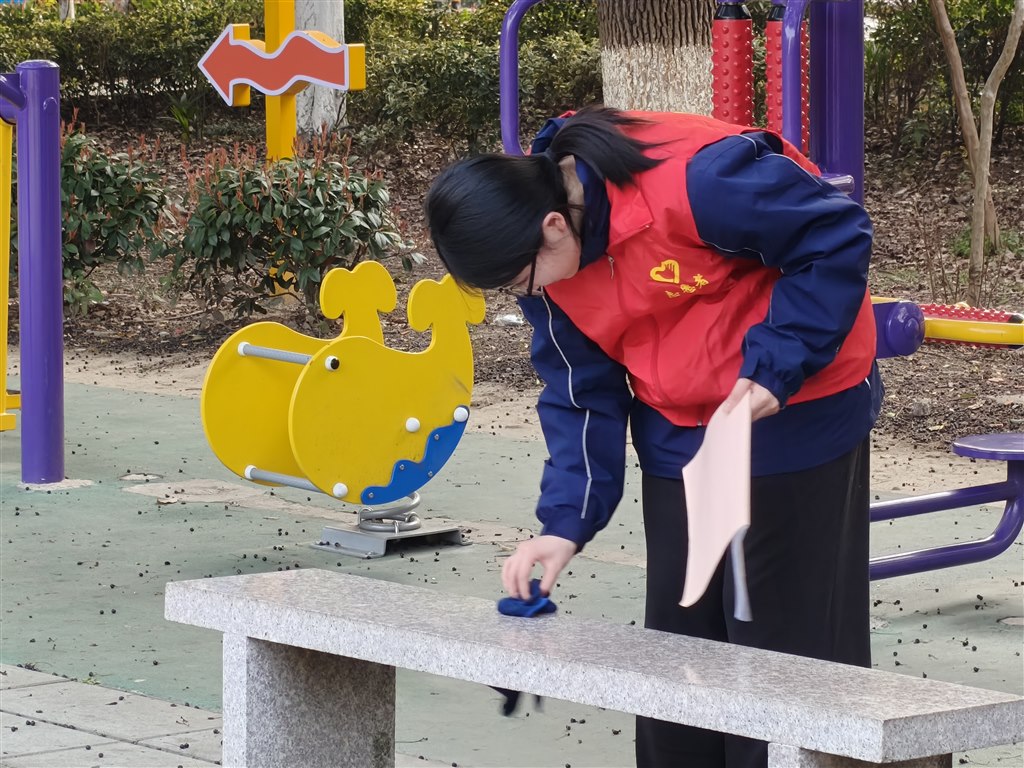 与此同时,另一组志愿者在社区广场和健身器材区域开展了热火朝天的卫生清洁行动。他们分工协作,有的挥动扫帚清扫路面落叶和杂物,有的拿着抹布仔细擦拭健身器材和休闲长椅,还有的弯腰捡拾广场中的白色垃圾。经过一个多小时的辛勤劳动,社区环境焕然一新,整洁的广场和锃亮的器材映衬着志愿者们的笑脸,成为春日里一道亮丽的风景线。