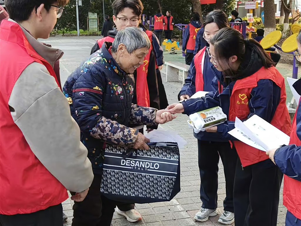 下午4点,身着红马甲的学生志愿者们在指导老师郝慧敏、俞丽婕和金香君的带领下准时集结在社区广场。本次活动分为“反诈宣传进社区”和“清洁家园我先行”两个板块同步进行。在反诈宣传环节,同学们化身“反诈小卫士”,通过发放宣传单、面对面讲解等方式,向社区老年居民普及电信诈骗的常见手段和防范技巧。为了让宣传更接地气、更有温度,志愿者们还特意准备了贴有“电话中奖莫惊喜,骗子已经盯上你”等反诈标语的鸡蛋,赠送给参与活动的居民。这种“硬核反诈+暖心礼物”的形式,既实用又暖心,受到了社区居民的热烈欢迎。