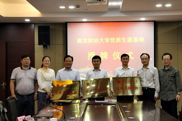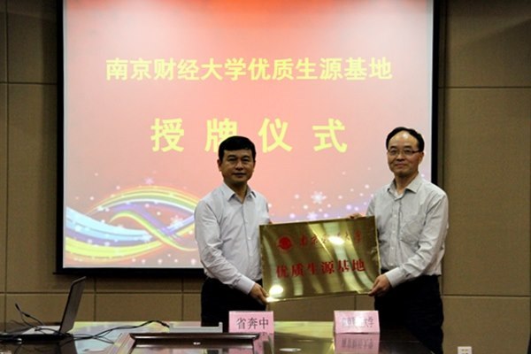 2016年6月2日上午,南京财经大学党委学生工作部部长、校学生处处长姚学峰等一行四人来到江苏省奔牛高级中学,在新北区社会事业局副局长、教育文体局局长杨杰的主持和见证下,与王奕飞校长签署了南京财经大学优质生源基地合作协议书,同时举行了优质生源基地授牌仪式。自此,省奔中正式成为南财大优质生源基地,高考志愿填报南财大的省奔中毕业生,将在同等条件下优先录取。
