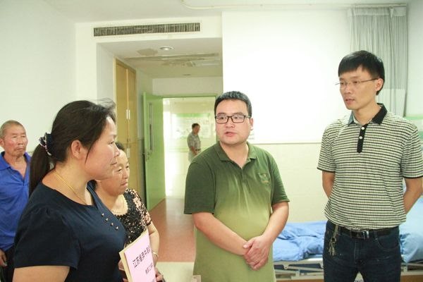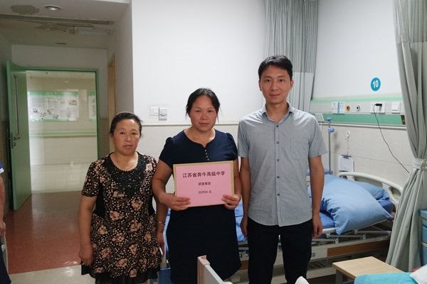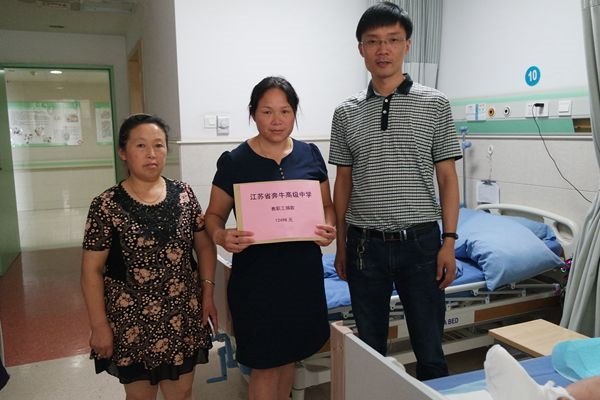 7月29日下午,省奔中工会副主席陈伟主任,校团委书记恽雪锋,行政办顾晓春主任,沈国英副主任,一行四人到常州市第二人民医院阳湖院区看望了张中华同学,并把善款交到了她姑姑手中。新北区社会事业局教育处严怀虎主任也陪同前往,并表示将继续集中多方力量,筹集张中华以及家人的治疗费用。严主任和陈主任鼓励他要有战胜磨难的信心和力量,安心养病,争取早日康复。其家人对所有关心和捐助的师生表示衷心的感谢。