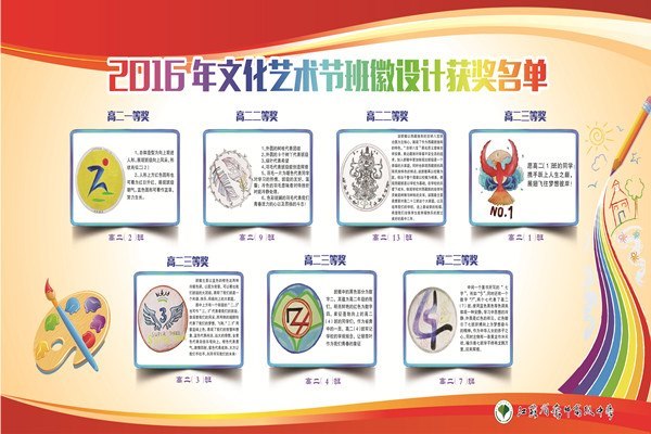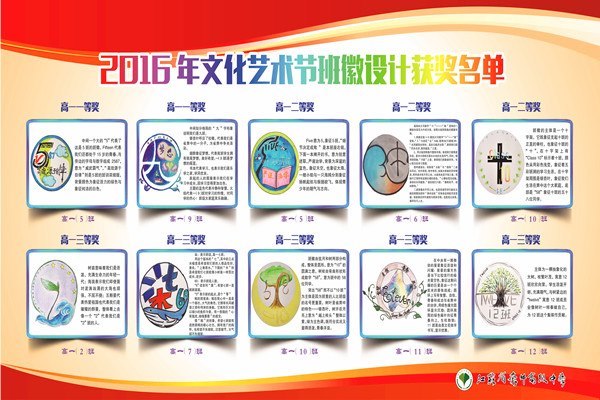 为展示学生的创新精神和设计能力,丰富学生的课余生活,校团委发动高一高二年级举行班徽设计大赛。比赛一经推出,就得到了同学们的积极响应。同学们以班级为单位,巧妙构思,设计出代表班级内涵与文化的班徽。最终各班选出一件最佳设计作品进行参评展示,学校艺术组对设计作品进行了评比,高一(5)班、高一(9)班获得高一年级班徽设计一等奖,高二(2)班获得高二年级一等奖。获奖作品都于学校学生园地橱窗展出。