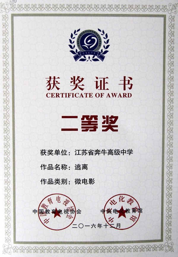 2016年12月5日,由中国教育电视协会、中央电化教育馆主办,中国教育电视协会中小学校园电视专业委员会承办的全国中小学校园互联网+应用研讨会暨全国中小学校园影视教育成果展示活动在江苏徐州落下帷幕。省奔中作品《逃离》荣获了第十三届全国中小学校园微电影二等奖。