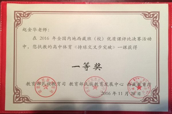 此次优质课比赛与论文评选是教育部民族教育司、教育部民族教育发展中心及西藏教育厅为深入贯彻《国务院关于加快发展民族教育的决定》和第六次全国民族教育工作会议精神,进一步提升内地民族班教育教学科研质量组织开展的。其中优质课评比活动由初赛(选送);复赛(评比录像课);进入决赛现场教学评比三个环节组成。赵金华老师从全国报送的115节录像课中脱颖而出,成为进入现场决赛的45节课中的一员。赵老师一路过关斩将,最终在决赛现场教学比赛中取得一等奖第一名的好成绩。这是赵金华老师继当选“西藏自治区模范班主任”(全国内地西藏班(校)只有2个名额)后获得的又一殊荣。