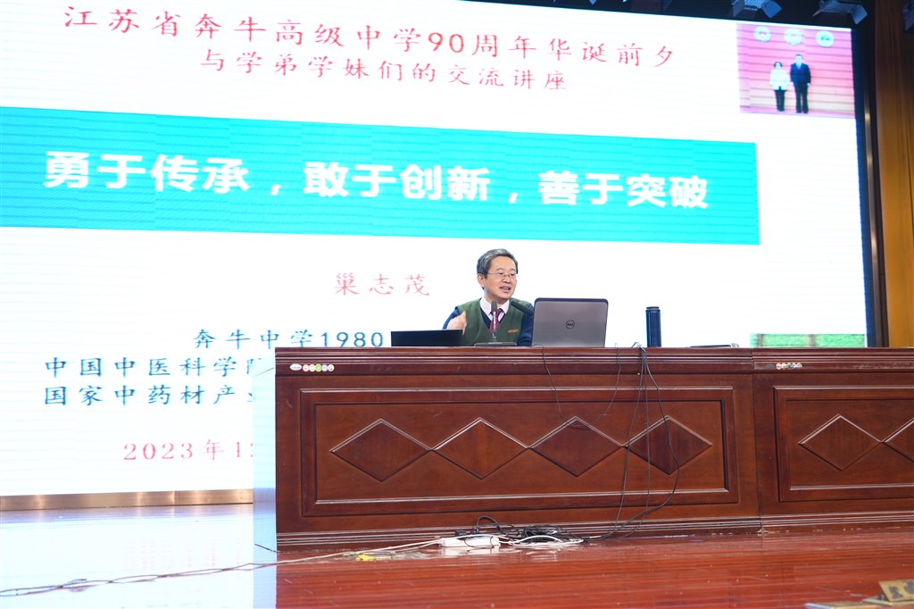 奔中学子的榜样——巢志茂2023年12月29日,江苏省奔牛高级中学90华诞前夕,省奔中80届校友巢志茂教授莅临我校,以“勇于传承,敢于创新,善于突破”为题,进行交流,开展讲座。